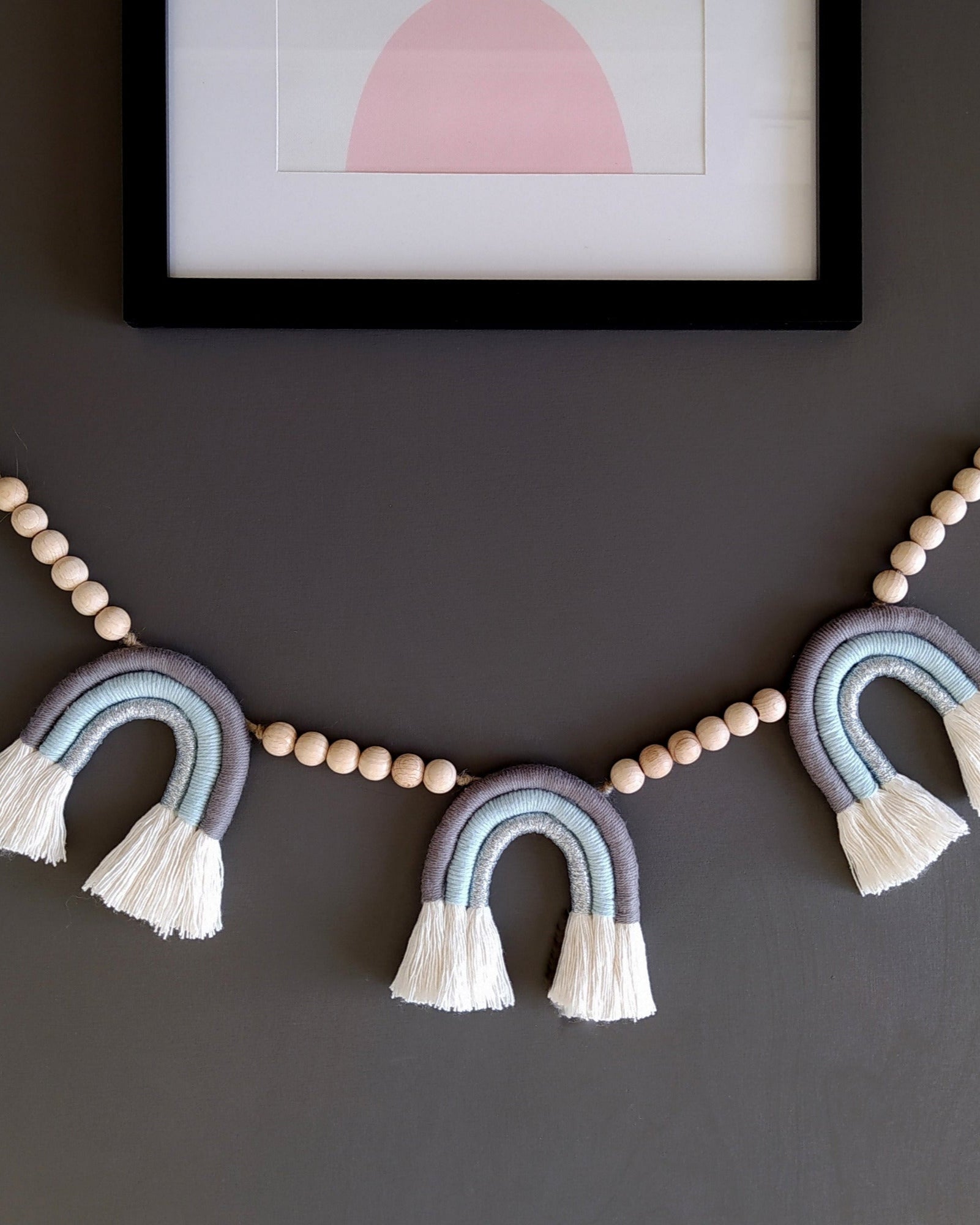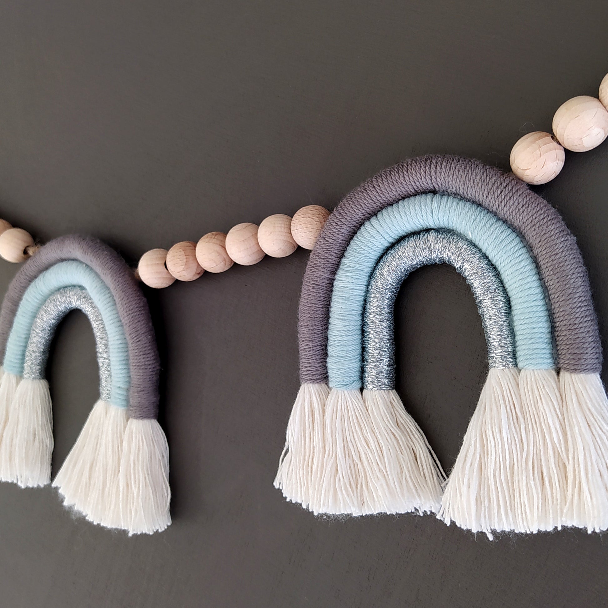 Näyttävä sateenkaariviiri on valmistettu huolellisesti käsityönä laadukkaista materiaaleista; puuvillalangasta- ja nyöristä. juuttinarusta ja puupalloista. Sateenkaarissa kätetty tehosteena hopeaista Lurex -lankaa. Viiri sopii hyvin lastenhuoneeseen, mutta löytää paikkansa myös muista kodin tiloista.