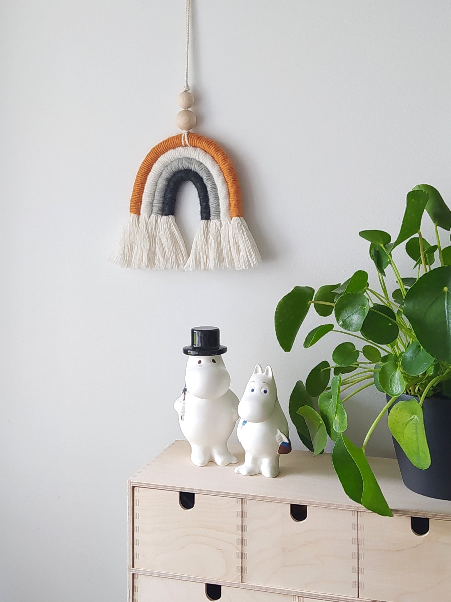 Ajaton sateenkaari -koriste on valmistettu huolellisesti käsityönä laadukkaista materiaaleista; pehmeästä villalangasta, puuvillanyöristä ja puupalloista. Sateenkaari sopii täydellisesti lastenhuoneeseen, mutta löytää paikkansa myös muista kodin tiloista.